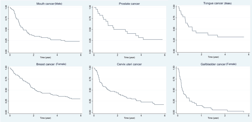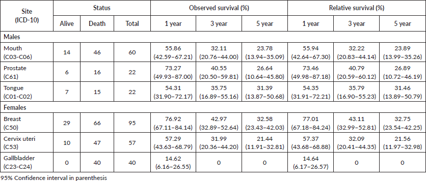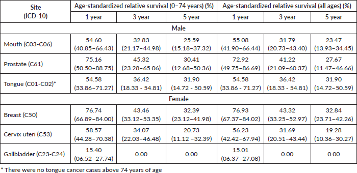 Among men, 5-year age-standardised relative survival (age 0–74 years) of mouth, prostate and tongue cancer cases were 25.59%, 30.41% and 31.90%, respectively. Similarly, among females, it was 32.39% of breast, 20.73% of cervix uteri. None of the gallbladder cases survived after 3 year and 5 years of diagnosis.