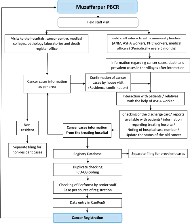 The PBCR follows the active method of case findings, wherein the registry staff visits the allotted villages every 6–8 months. They conduct group meetings with Auxiliary Nurse Midwives (ANMs), Anganwadi workers, Accredited Social Health Activists (ASHA) workers, JEEViKA workers (staff appointed by the Bihar Rural Livelihood Promotion Society) and key stakeholder to collect information on cancer cases and deaths. After interacting with the patients/relatives, the registry staff collects the details of the cancer cases and confirms them through respective sources. The source of cancer case information includes the village administration office, hospitals, medical colleges, cancer centres, radiology and pathology laboratories, as well as the birth and death registrar’s office. The registry staff visits these sources, collects relevant clinical details of the cancer case and registers the case in the prescribed proforma. In case of inaccessibility to the medical records of the patient, staff register the case based on the information provided by the patient/patient’s relatives. Muzaffarpur PBCR covers more than 50 sources, including the ones from Patna, Darbhanga, Varanasi and Mumbai [6].