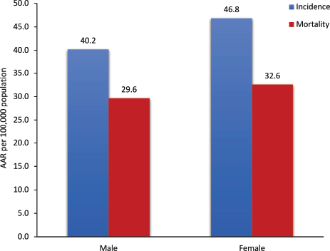 The age-adjusted incidence rate per 100,000 population for males was 40.2 and 46.8 for females. The cumulative risk in males aged 0–74 years was 4.4% (1 in 23 males were at risk of developing cancer) and in females, it was 5.1% (1 in 20 women were at risk of developing cancer).