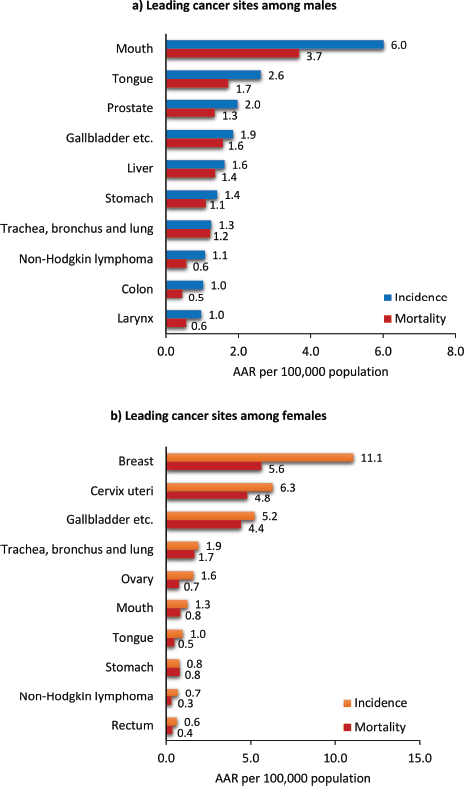 The leading cancer sites for males are the mouth (AAR 6.0 per 100,000 population), tongue (2.6), prostate (2.0), gallbladder (1.9) and liver (1.6). The leading cancer sites among females were breast (11.1 per 100,000 population), cervix uteri (6.3), gallbladder (5.2), trachea, bronchus and lung (1.9) and ovary (1.6). The leading cancer sites among males and females are presented in Figure 4. The comparison of the leading sites of Muzaffarpur with other cancer registries is shown in Table 1 [6, 1522].
