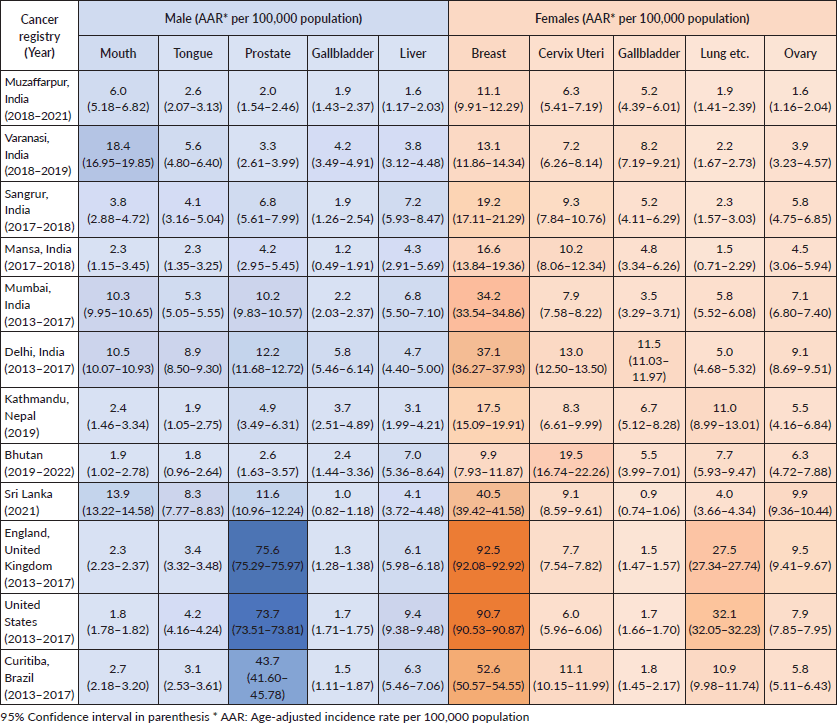 Table 1. Comparison of leading sites of Muzaffarpur PBCR with other Indian cancer registries with neighbouring and developed countries.