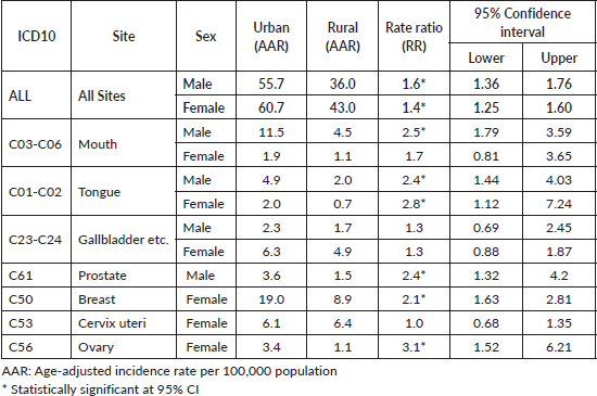 For tongue cancer incidence among males, AAR was 2.4 times higher in urban areas (4.9) as compared to rural areas (RR:2.4, 95% CI (1.44–4.03)). The difference between rates was statistically significant.