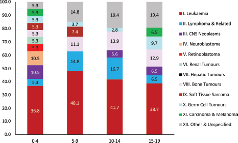 Of the total cancer cases 82 (2.8%) [Boys: 55, Girls: 27] pediatric cases registered in the age group 0–14 years and 113 (3.9%) (Boys: 72, Girls: 41) in the age group 0–19 years. The pediatric age group ranges from 0 to 14 years of age. The cancer incidence AAR for boys in the 0–14 age group is 35.3 per million population and 17.7 per million for girls. The majority of cancer in the pediatric age group was Leukaemia, which consisted of more than 40% of the cases, followed by Lymphoma and related categories. The distribution of pediatric cancer is presented according to the format of International Classification for Childhood Cancer, Third Edition , [23] which presents the pediatric cancer burden for the age groups from 0 to 19 years of age. The site-wise distribution of pediatric cancer cases is presented in Figure 5.