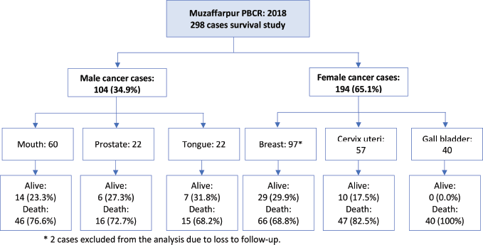 As the registry staff follows an active method of case follow-up, we have the updated vital status for 298 cancer cases. Two cases whose vital status could not be followed up by registry staff were excluded from the analysis.