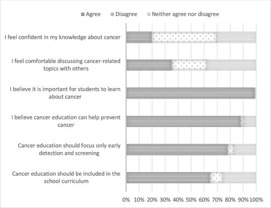 From the response, about 55.7% of the 756 responders are female and 44.3% are male. The respondents’ age ranged from 18 to 33 years old, with an average age of 23. According to Figure 1, 20% of the students’ sources of cancer education came from friends or family and social media sites combined. This is followed by 18% from online resources, 15% from cancer awareness events or campaigns, 14% from healthcare providers, 11% from textbooks and journals and 2% from other sources, including cigarette covers. Students’ perceptions of cancer education are depicted in Figure 2, where 64.52% of them agrees on its inclusion in the curriculum while 10.17% disagrees. About 78.05% of students support emphasising early detection and screening in cancer education, compared to 4.95% who disagree. However, 87.95% think that cancer education can prevent cancer. Also, 98.53% of students think it’s important to learn about cancer, compared to 0.54% who disagree and 35.07% of students feel comfortable talking to others about cancer-related topics. Only 19.68% of students felt sure about their knowledge about cancer, whereas 50.20% disagreed.