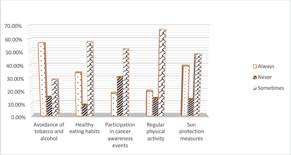 Figure 3 illustrates a lifestyle linked to cancer: 56.76% of students constantly abstain from alcohol and tobacco, compared to 14.73% who never do so and 28.51% who do so occasionally. 33.87% of students follow a healthy diet, 8.30% never do and 57.83% occasionally do. 30.25% never and 51.94% occasionally participate in cancer awareness events, compared to 17.80% who do so often. 19.41% of students engaged in physical activity consistently, 13.65% never did so and 66.93% did so occasionally. While 39.09% of students constantly use sun protection measures, 12.85% of students never use them and 48.06% of students use them occasionally. Supplementary Figure 1 illustrates the various ways that students preferred to learn about cancer. Of these, 33.8% preferred awareness campaigns or events, followed by lectures and discussions in the classroom (22.4%), interactive workshops and activities (21.1%), online educational resources (14.4%) and peer-led discussions or presentation techniques (14.1%). A thorough summary of the students’ cancer education information is given in Table 1. Of the students, 59.5% possess knowledge about cancer education, while 40.5% lack it. While 70.8% of the students were conscious of how we come in contact with carcinogens and 43.16% students were enlightened on some of the information we need to determine if a substance might cause cancer. The student’s knowledge and awareness on cancer education scores were highly significant (p = 0.000).