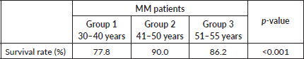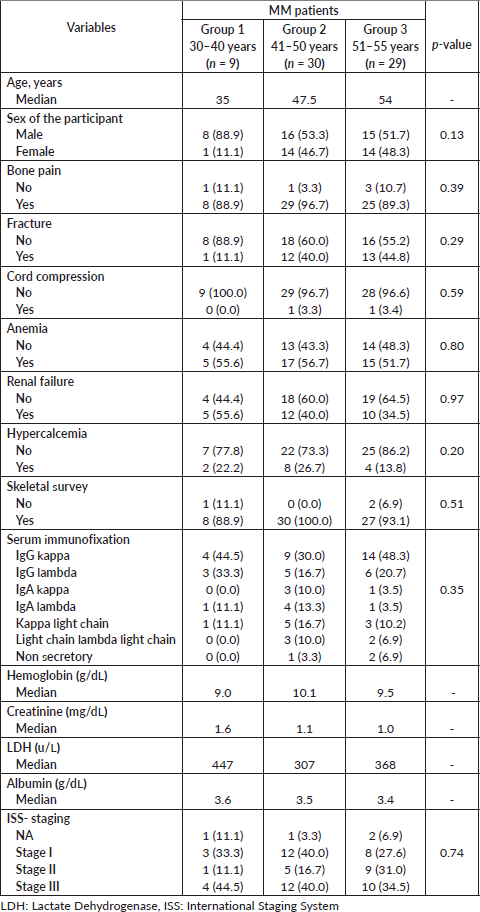 Results: This study encompassed 68 confirmed MM patients, categorised by age groups: 30–40 years (13.23%), 41–50 years (44.11%) and 51–55 years (42.64%). Predominantly male (1.3:1 ratio), bone pains were prevalent among all groups, with 51–55 years exhibiting the highest pathological fracture rate. 30–40 years group showed higher renal impairment rates and lactate dehydrogenase levels. Velcade, thalidomide and dexamethasone were commonly used first-line regimens in the entire cohort in 41.17% of patients, closely followed by cyclophosphamide, bortezomib and dexamethasone in 29.41%. Partial response was predominant in the 30–40 years group, while other age groups showed varied responses. The younger patients demonstrated lower deep treatment response rates than their older counterparts. Progression-free survival was 37, 52 and 45 months orderly in each group, with a p-value of <0.001. The median overall survival (OS) for the entire group was 50.6 months (4.2 years), with OS rates of 77.8% (CI: 95%), 90.0% (CI: 95%) and 86.2% (CI: 95%), respectively, with a p-value of <0.001. Median OS in months was 45, 55.5 and 52, with a p-value of 0.08.