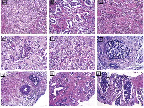 Figure 1. H&E-stained sections from studied PC cases. (a and b): A case of well-differentiated PC Gleason score 3 showing uniform glands with spaces between them. The glands are lined by a single layer of malignant cells (×200 and ×400, respectively. (c–e): Cases of poorly differentiated PC Gleason score 9 showing infiltrating fused glands admixed with sheets and cords of malignant cells ×200 and ×400, respectively. (f): A case of moderately differentiated PC Gleason score 7 showing perineural infiltration ×400. (g): a case of moderately differentiated PC Gleason score 7 showing malignant glands near muscular blood vessel ×400. (h and i): Moderately differentiated PC Gleason score 7 showing medium sized glands with undulating luminal contours and large branching glands with areas of cribriforming ×200.