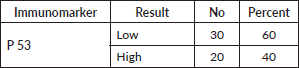 Tumour P53 expression was found to be low in 60% of studied prostatic carcinoma (PC) cases as shown in Table 7 and Figure 4. Regarding the relation between P53 immunoexpression and the available clinicopathological features, there was a significant positive relation between its expression and serum PSA levels and serum Human P53 concentrations (p value 0.001*) for both, as illustrated in Table 8. There was no statistically significant relation between P53 immunoexpression and any of the studied histopathological results as shown in Table 9.