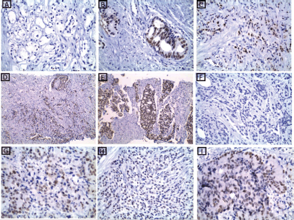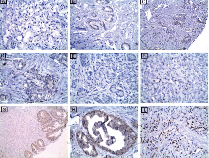 Figure 4. p53 immunohistochemical results. (a): A case of well-differentiated PC Gleason score 3 showing low nuclear expression of p53 ×200. (b): A case of moderately differentiated PC Gleason score 7 showing low nuclear expression of p53 ×400. (c and d): A case of moderately differentiated PC Gleason score 7 showing low nuclear expression of p53 ×200 and ×400, respectively. (e): A case of moderately differentiated PC Gleason score 7 showing low nuclear expression of p53 ×400. (f): A case of poorly differentiated PC Gleason score 9 showing low nuclear expression of p53 ×400. (g and h): A case of moderately differentiated PC Gleason score 7 showing high nuclear expression of p53 ×200 ×400, respectively. (i): A case of poorly differentiated PC Gleason score 9 showing high nuclear expression of p53 ×400.