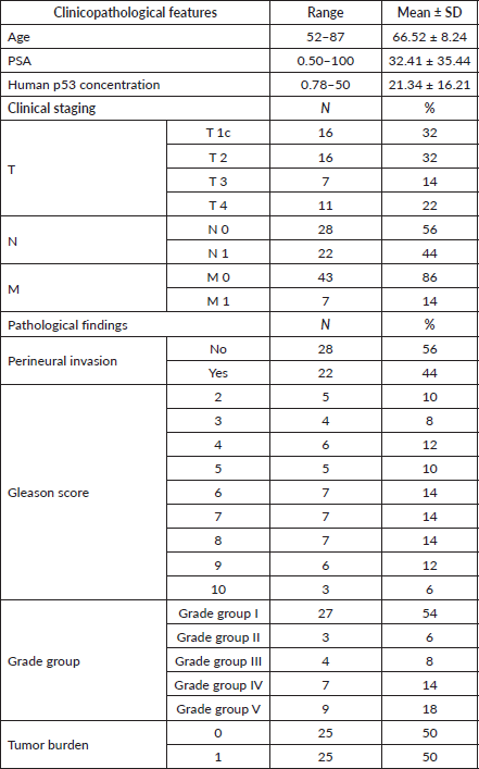 The present study included 50 cases of prostatic adenocarcinoma. Patient characteristics were shown in Table 1. The age of the patients ranged from 52 to 87 years old. PSA plasma levels ranged from 0.50 to 100 ng/dL. Human p53 serum concentration levels ranged from 0.78 to 50 U/mL.