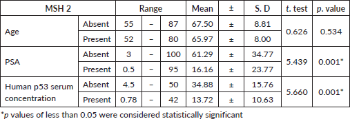 Results: There was a significant positive relation between mutS homologue 2 (MSH2) immunoexpression and both PSA serum level and P53 serum concentration (p value 0.001*). Also, there was a significant relation between MSH2 immunoexpression and tumour size, nodal metastasis, distant metastasis and grade grouping. While mutL homologue 1 (MLH1) immunoexpression showed a significant relation with human P53 serum concentrations only (p value 0.035*). Moreover, MLH1 immunoexpression showed only significant relation with nodal metastasis and tumour burden, p value was 0.033* and 0.001*, respectively.