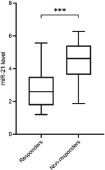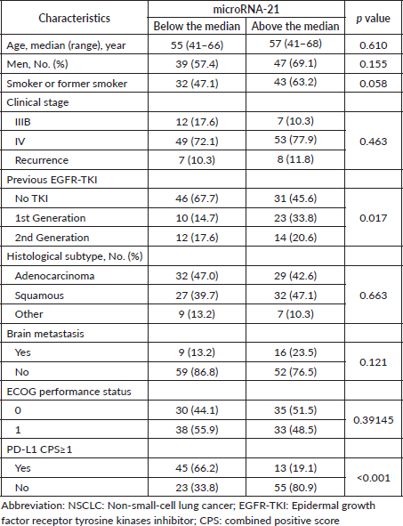 Methods: We included 136 advanced NSCLC patients and miR-21 levels were identified. The combined positive score (CPS) was calculated and CPS≥1 was considered PD-L1 positive tumour cells in patients with NSCLC. Circulating miR-21 expressions between responders and non-responders were analysed. The overall survival (OS) and progression-free survival (PFS) according to miR-21 status were also investigated.