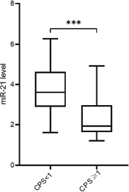 Figure 1. (a): The relative expression of circulating miR-21 between the responders and NR in NSCLC patients. (b): The relative expression of circulating miR-21 between NSCLC patients with CPS≥1 or CPS<1.
