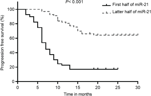 Figure 4. PFS of patients with NSCLC with different levels of miR-21 according to the 50th percentile of miR-21 concentrations in the overall distribution.