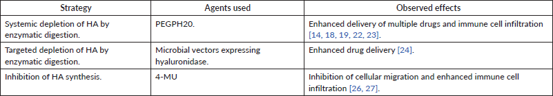 The rationale of using microbial vectors to deliver hyaluronidase into tumours is to provide preferential degradation of HA in the tumour without affecting that of normal tissues, thus achieving better efficacy and less toxicity. Ebelt et al [24] developed a novel, promising strategy for administering hyaluronidase using a live attenuated strain of the bacterium Salmonella typhimurium; this bacterium expresses a functional bacterial hyaluronidase; they colonise murine models of PDAC tumours following intravenous administration and induce tumour-specific HA depletion. Potentiated the cytotoxic effect of gemcitabine in these models [24].