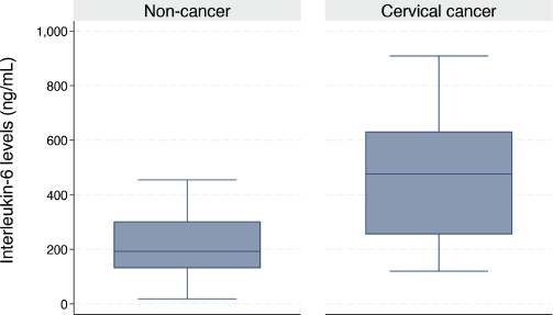 Figure 4. Box plot showing the serum IL-6 levels in women with or without cervical SCC (523.9 (IQR: 365.1–682.1) versus 203.6 (IQR: 131.3–334.3)).