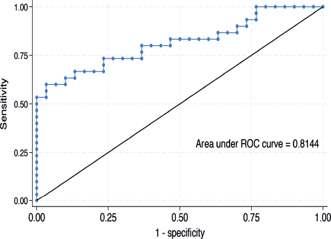 Figure 2. ROC showing an AUC of 0.814 (95%CI 0.704–0.925) at a discriminatory serum IL-6 cut-off value of 365.1 ng/mL.