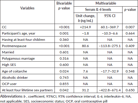 Methods: We conducted a cross-sectional study among women with and without CC in two hospitals. A venous blood sample was collected from each participant for laboratory analysis of serum IL-6 levels. We performed simple and multiple linear regression analyses to compare the unit increase in serum IL-6 levels between study groups while adjusting for relevant confounders.