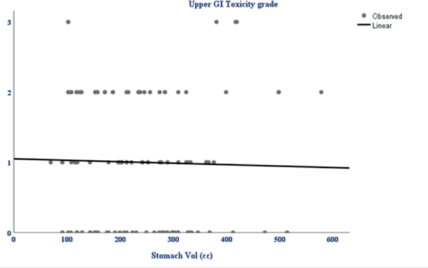 Figure 2. Scatterplot showing the relationship between stomach volume (cc) and upper GI toxicity grade. The linear trendline indicates a weak negative correlation, suggesting no significant association between increasing stomach volume and upper GI toxicity grade.