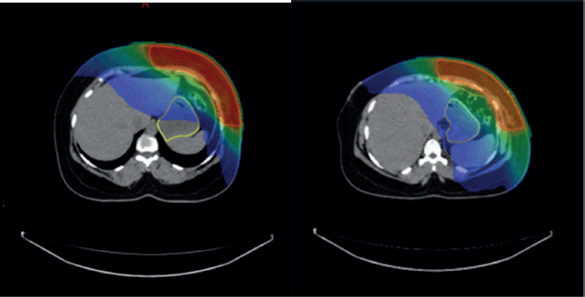 Supplementary Figure 1. (a and b): Axial CT scan showing stomach position in FB (VMAT Technique), Figure 3b: showing stomach position in DIBH (VMAT Technique).