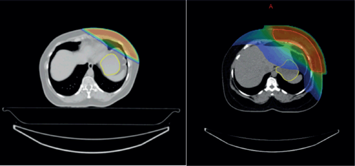 These findings reinforce the protective role of DIBH, which minimises dose exposure to the stomach by reducing motion-related variability and improving treatment reproducibility due to physiological changes occurring during DIBH technique leading to expansion in lung volumes and displacement of diaphragm in downward direction leading to lower iso dose curves on stomach, hence reduced toxicity.