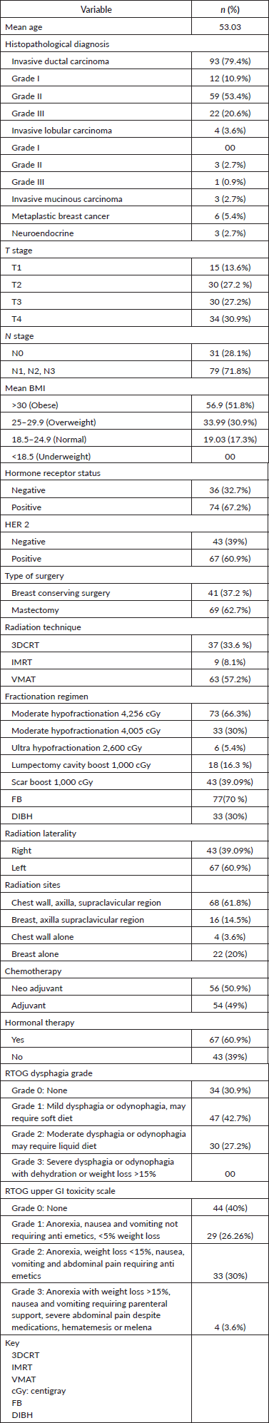 Data collection was conducted through the radiation oncology information system, Adaptive RT Integrated Algorithm, along with weekly reviews of patients' charts and electronic files. Patients receiving adjuvant RT to the breast/chest wall with or without RNI were included. Patients' demographics and clinical characteristics, including age, body mass index (BMI), tumor, node, metastasis, staging, hormone receptor status, type of fractionation regimen prescribed, volume treated and techniques 3DCRT, IMRT or VMAT used were recorded. A comparative analysis of acute upper GI toxicity outcomes across these techniques was planned. The side effect profile of patients was ascertained from weekly chart reviews done during the treatment process as per the RTOG scale for upper GI toxicity (nausea and vomiting) and dysphagia scale. Exclusion criteria for the study included male breast cancer, metastatic disease and individuals with a known history of upper GI disorders, such as peptic ulcer disease, dysphagia or esophageal motility disorders as these conditions may complicate the assessment process and their inclusion could confound the study outcomes.