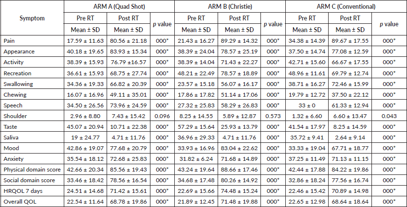Soni et al [14] in his study reported that statistically significant improvements were observed in scores of pain, appearance, activity, recreation, mood, anxiety, physical domain score, social domain score, HRQOL 7 days and overall QOL (20+-1.51 to 60+-23.77) with reduction in taste and saliva score in the Quad shot arm. For the Christie regimen and conventional regimen also, pattern of improvement and reduction in score of domains was same with different values (20+-3.65 to 40+-24.16) and (20+-7.43 to 60+-21.87), respectively. Although, more improvement was observed in the Quadshot schedule in the physical domain, social domain, HRQOL7 days and overall QOL as compared to other arms. In a study by Ghoshal et al [11] psychosocial domain, HRQOL, overall QOL and almost all physical symptoms scores improved significantly. Das et al [13] also reported that there was an enhancement in all aspects of QOL. Kumar et al [16] reported that symptomatic relief was better in Quad shot arm. Al-Mamgani et al [12] better QOL of patients in Christie arm. QOL enhancement was also seen in a study by Corry et al [8] in quadshot arm. In the present study, there was significant improvement in overall QOL in all the arms (p value <0.001) with values of (22.54+-1.64 to 68.78+-19.68) in ARM A, (21.89+-12.45 to 71.48+-19.88) in Arm B, (22.65+-68.64 to 18.64) in ARM C. There was significant amelioration in pain, appearance, swallowing, chewing, speech, activity, recreation, mood and anxiety. Score declined for taste and saliva in all the arms significantly. Symptomatic refinement was maximum in Arm B. Most of the studies till now have reported pain as the commonest symptom, which was in accordance with this study. Pain score improved maximum in Christie arm from 21.43+-16.27 to 89.29+-14.32.