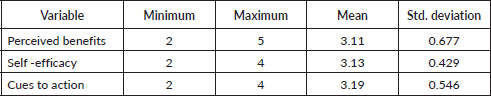 As presented in Table 2, the descriptive statistics for the HBM constructs of self-efficacy, cues to action and perceived benefits were analysed for a sample of 204 participants, with findings indicating a moderate level of perception across all three constructs. The mean score for self-efficacy was 3.11 (SD = 0.677), which suggests a moderate level of self-confidence but with the highest variability among responses. Cues to action had the highest mean score at 3.19 (SD = 0.546), indicating that participants generally perceive a moderate level of motivation. Lastly, perceived benefits showed a mean score of 3.13 (SD = 0.429), with the lowest standard deviation, which points to a more