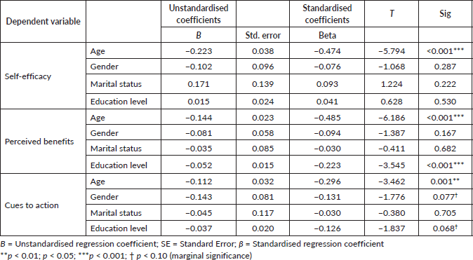 Results: The mean age of participants was 54 years; 54% were male and 46% female. Overall, 38% used social media for healthcare purposes. Perceptions across the HBM constructs were moderate to high. Cues to action had the highest mean score at 3.19 standard deviation (SD = 0.546), followed by perceived benefits (M = 3.13, SD = 0.429) and self-efficacy (M = 3.11, SD = 0.677). Age significantly negatively predicted self-efficacy (B = −0.223, β = −0.474, p < 0.001), perceived benefits (B = −0.144, β = −0.485, p < 0.001) and cues to action (B = −0.112, β = −0.296, p = 0.001).