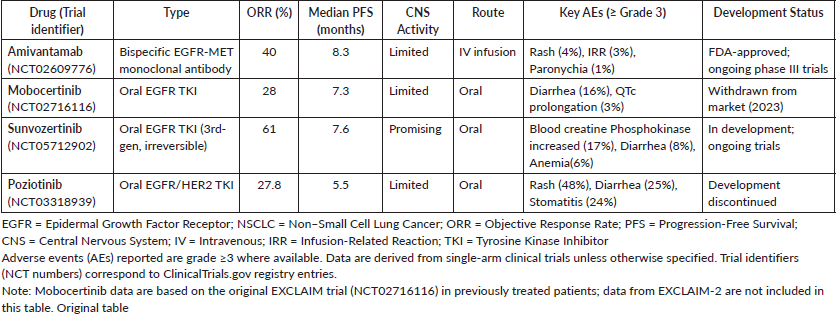 Mobocertinib (Exkivity) is an oral TKI designed to target EGFR exon20ins mutations in NSCLC, a subset known to be resistant to earlier-generation EGFR inhibitors. In 2021, the FDA gave accelerated approval for patients with metastatic or advanced NSCLC who had progressed while receiving platinum-based chemotherapy [18]. However, after the EXCLAIM-2 trial (NCT04129502) failed to demonstrate a definite advantage over conventional chemotherapy in the first-line setting, Takeda voluntarily removed the medication from the market in 2023 [33–35]. Although there was a lot of interest in mobocertinib at first, especially given how challenging EGFR exon20ins mutations are to treat—its modest effectiveness and side effects like diarrhea and QTc prolongation ultimately kept it from becoming a widely used option.