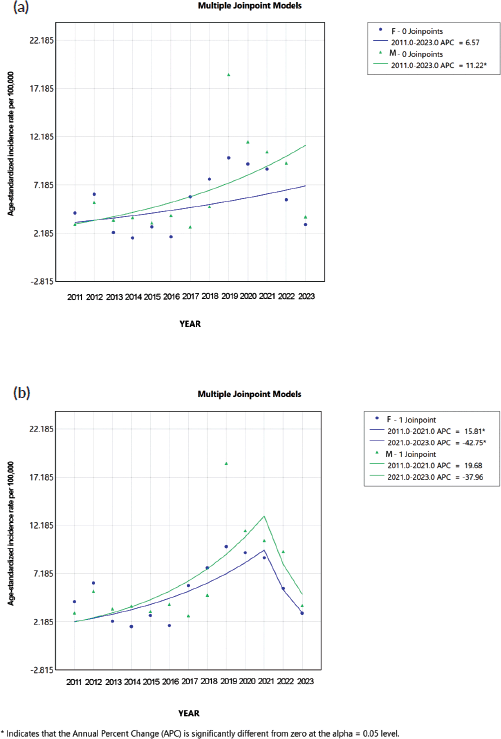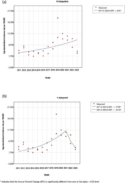 Figure 2. Joinpoint regression analysis of age-standardised CRC incidence rates per 100,000 inhabitants in the general population (aged 20 and older) from 2011 to 2023 in Metepec, Mexico. (a): A Model with zero joinpoints showing a statistically significant upward trend in incidence rates across the entire period (APC = 8.81%, p = 0.01). (b): Model with one joinpoint identifying two distinct segments: a significant increase from 2011 to 2021 (APC = 17.90%, p < 0.01), followed by a significant decrease from 2021 to 2023 (APC = –41.34%, p = 0.03). APC: Annual Percent Change. Significance set at α = 0.05.