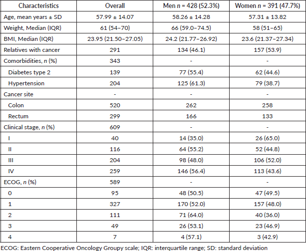 Between 2011 and 2023, a total of 819 individuals with CRC were included in the study, the majority of whom were men (52.3%). The mean age was 58.3 years (SD ± 14.3) and 57.3 years (SD ± 13.8) for men and women, respectively. Family history of any cancer was positive in 400 (48.8%) subjects, whereas specific CRC history was present in 291 (35.5%). Regarding the clinical stage at diagnosis, 259 (31.6%) were reported in stage IV, 204 (24.9%) in stage III, 200 (24.4%) as an unclassified stage, 116 (14.2%) in stage II and 40 (4.9%) in stage I, while the remaining individuals had missing data regarding clinical stage. Table 1 presents the characteristics of the included individuals.