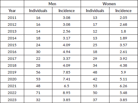 Over the 13 years, men had a slightly higher median incidence rate (4.09/100,000) than women (3.85/100,000). Peak rates were also higher in men (8.95/100,000 versus 6.28/100,000), indicating a statistically significant difference between sexes (p = 0.01) (Table 2).