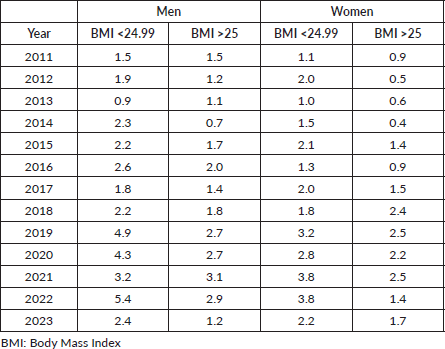 We divided the population based on sex and obesity status based on BMI, obtaining two groups: BMI <24.99 and BMI >25. Incidence rates were calculated, considering the specific population of men and women in the proposed period (Table 3). When comparing the trends of both groups based on BMI, a significant difference was found between the two populations for both men (p < 0.01) and women (p = 0.01). Additionally, when comparing the trends between the groups with BMI <24.99 for women and men and BMI >25 for men and women, significant differences were also identified (p = 0.04 and p = 0.04).