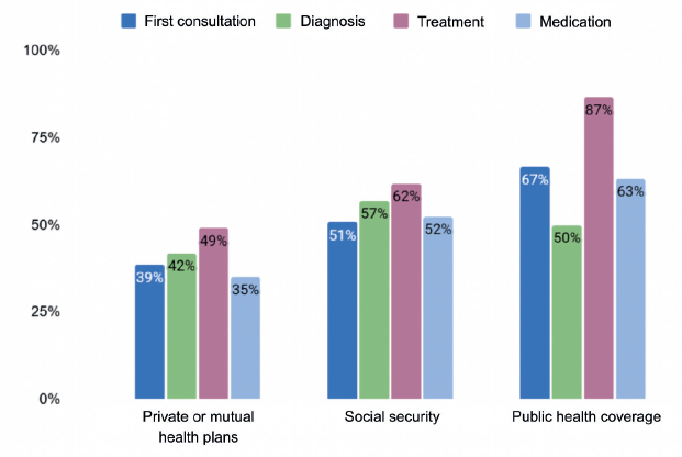 Figure 1. Difficulties in accessing different stages of the patient pathway by type of coverage, in percentage values.