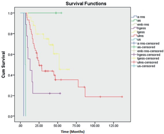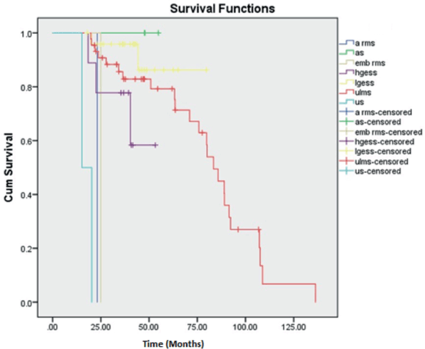 The median follow-up time was 37 months (Range 4–182 months). The overall recurrence rate in our study was 56.5%. To subclassify, it was seen in 28 (33%) cases of ULMS, 9 (36%) cases of LGESS, 7 (77.8%) cases of HGESS and 4 cases of the OTHERS category. AS patients had no recurrence.