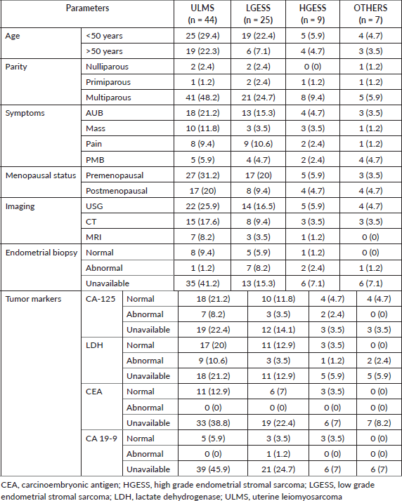 Clinical characteristics are described in Table 1. The mean age of presentation in our study was 50.8 years for ULMS, 45.5 years for LGESS, 48.1 years for HGESS and 49.6 years in the OTHERS group. The majority belonged to the less than 50 years age group in all the categories (62.4%) and were premenopausal (57.1%). Both the cases of UUS were postmenopausal. Abnormal uterine bleeding (AUB) was the foremost presenting symptom in majority of the groups (ULMS = 21.2%, LGESS = 15.3%, HGESS = 4.7%).