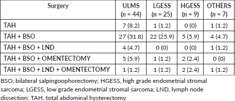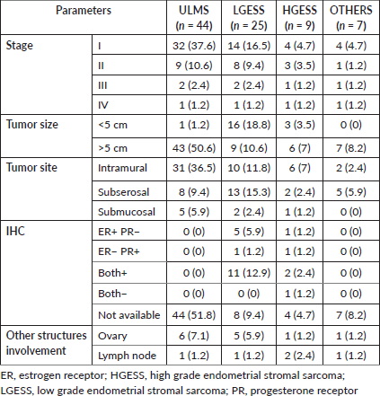 Pathological characteristics are described in Table 2. The majority of cases were predominantly diagnosed in stage I (ULMS = 37.6%, LGESS = 16.5%, HGESS = 4.7%; OTHERS = 4.7%) followed by stage II (ULMS = 10.6%, LGESS = 9.4%, HGESS = 3.5%; OTHERS = 1.2%). Stage III presentation was seen in two (2.4%) cases each of ULMS and LGESS and one (1.2%) case each of HGESS and OTHERS category. There was one (1.2%) case each of stage IV in all the categories.