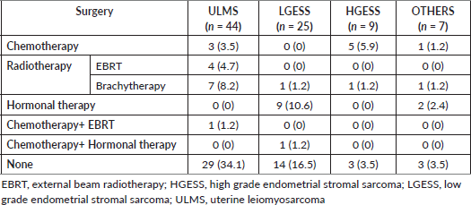 Surgical management with TAH with BSO was the primary mode of surgery in the majority in all the categories (ULMS = 31.8%, LGESS = 25.9%, HGESS = 5.9%; OTHERS = 4.7%). LND was done in 5 (5.9%) cases of ULMS, 1 (1.2%) case of LGESS and 2 (2.4%) cases each in HGESS and OTHERS categories. Omentectomy was done in six (7%) of ULMS, two (2.4%) cases of LGESS, four (4.7%) cases of HGESS and one (1.2%) case of OTHERS group. Adjuvant treatment was administered in 36 (42.5%) cases (Table 3). Radiotherapy in the form of Brachytherapy (8.2%) and EBRT (4.7%) were the major form rendered in ULMS. Hormonal treatment with letrozole was principally administered in LGESS (10.6%) and OTHERS category (2.4%). Chemotherapy with Docetaxel and Gemcitabine regimen was preferably administered in majority in HGESS (5.9%) (Table 4).