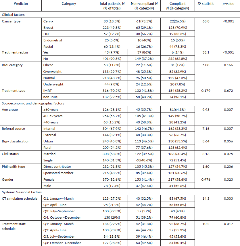 Conclusion: In this Philippine public cancer center, RT non-compliance is driven by clinical vulnerability and dynamic systemic pressures, not static patient demographics. These findings highlight the need to shift from passive risk assessment to proactive, risk-stratified interventions. Implementing strategies such as patient navigation and support programs, adjusted for predictable seasonal pressures, can mitigate vulnerability, improve treatment adherence and ultimately enhance cancer outcomes in resource-constrained settings.