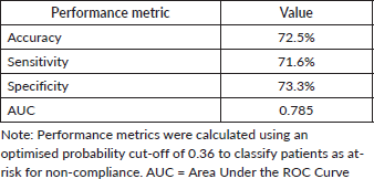 To identify independent predictors, a three-step hierarchical binary logistic regression was performed. Each sequential block of predictors, sociodemographic, clinical and systemic/seasonal, contributed a statistically significant improvement to the model's predictive power (Table 6). The final model explained 32.8% of the variance in non-compliance (Nagelkerke R²) and demonstrated good discriminatory ability with an Area Under the ROC Curve of 0.785. At an optimised classification threshold, the model achieved an overall accuracy of 72.5% (Table 7). Collinearity diagnostics showed all VIF values were below 2.0, indicating no issues with multicollinearity.