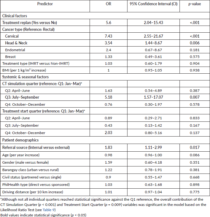 Clinical factors were most prominent. Compared to patients with rectal cancer, the odds of non-compliance were over seven times higher for patients with cervical cancer odds ratio (OR = 7.43, p < 0.001) and over three times higher for HNC (OR = 3.54, p = 0.006). The need for a treatment replan was also a strong predictor, associated with over five times the odds of non-compliance (OR = 5.60, p < 0.001). Among systemic factors, patients referred internally within BatMC had 1.8 times the odds of non-compliance compared to those referred externally (OR = 1.83, p = 0.017). Finally, seasonal timing was a significant predictor. While not all individual quarters reached statistical significance against the quarter 1 (Jan–March) baseline, Likelihood Ratio Tests confirmed that the overall variables for CT Simulation Quarter (p < 0.001) and Treatment Start Quarter (p = 0.009) were significant contributors to the model (Table 9). The data revealed a clear trend of escalating risk across the year. The highest risk was associated with undergoing CT simulation in the third quarter (July–September; OR = 5.18) and starting treatment in the fourth quarter (October–December; OR = 2.03) when compared to the first quarter. Other variables, such as age, BMI and travel distance, did not remain significant predictors after adjusting for other factors.