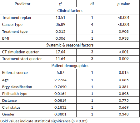 Results: The overall non-compliance rate was 42.4%. The final multivariable model revealed that non-compliance was primarily driven by a convergence of clinical and systemic factors rather than patient demographics. The strongest predictors reflected clinical severity, specifically cancer type [cervical: odds ratio (OR) = 7.43; head and neck: OR = 3.54] and the need for a treatment replan (OR = 5.60). Systemic factors were also significant predictors, including an internal referral source (OR = 1.83) and treatment timing. Specifically, the risk of non-compliance increased for patients undergoing computed tomography simulation in the third quarter (July–September) and for those starting treatment in the fourth quarter (October–December), which are periods associated with regional climatic and socioeconomic pressures.