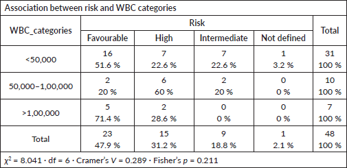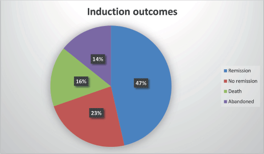Conclusion: Demographic variables, nutritional status, WBC count and clinical presentations were not associated with induction outcomes, possibly due to the availability of extensive supportive care services such as accommodation near the hospital, free food and treatment and psychosocial support in the paediatric oncology unit. In contrast, ELN risk categories were strongly associated with outcomes.