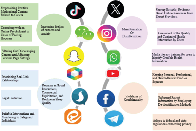 This study highlights the dual nature of social media in the context of cancer care serving both as a valuable tool for education, support and communication, and as a source of significant challenges. On the one hand, SNs empower patients by enhancing their knowledge, providing emotional support through peer connections, and offering accessible avenues for healthcare engagement. On the other hand, concerns such as misinformation, emotional distress, breaches of confidentiality, social disconnection, commercial exploitation and sleep disturbances reveal the urgent need for responsible use and professional oversight.