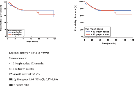 The mean and standard deviation of the quantitative variables were calculated; in the case of qualitative variables, their frequencies and percentages were calculated. The results were arranged in unidimensional tables and contingency tables. Differences between groups, <10 nodes and ≥nodes, in the case of qualitative variables, were performed with Pearson's chi-square test; in the case of quantitative variables, the Student's t-test for independent samples was applied, after normality check, with the Shapiro–Wilk test. OS and DFS were determined using the Kaplan–Meier procedure, and the differences between the survival curves were determined using the log-rank test. A value was considered statistically significant if p < 0.05. Data were tabulated with R Studio version 2024.12.0+467. The hazard ratio (HR) was calculated using a Cox proportional hazards model. Relevant independent variables were adjusted for and model assumptions, including proportional hazards, were checked. The HR was interpreted as the change in the risk of event occurrence between groups, holding all other variables constant. A value was considered statistically significant if p < 0.05. Data were tabulated with R Studio version 2024.12.0+467.