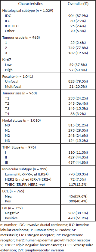 The pathological characteristics are summarised in Table 2. In terms of tumour size majority had T1 and T2 disease (24% and 56%, respectively). Only a third of the patients had negative lymph node metastasis at diagnosis. In the overall TNM stages, stages II and III were very frequent, 44% each. The most common histological subtype was invasive ductal carcinoma (IDC) (87.9%, n = 904), while classical invasive lobular carcinoma (ILC) was rarer (2.9%). Most patients had intermediate to high-grade tumours (77.8% and 19.6%, respectively). Ki-67 was not routinely performed, but among the patients in which it was done majority of them (62%, n = 97) had high Ki-67 (>20%). Forty percent of the patients had extracapsular extension (ECE) involvement. ER/PR positive was present in 80%, HER2 positive in 23% and TNBC in 12%.