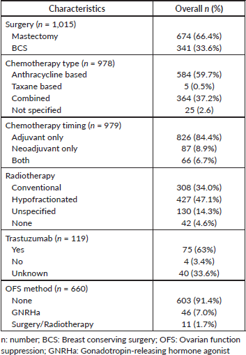 The treatment used is summarised in Table 3. Mastectomy was the most commonly performed surgery (66%), with only a third of the patients undergoing BCS. Only 9% of the patients were treated by neoadjuvant chemotherapy, with the majority (84%) receiving chemotherapy in the adjuvant set-up, while 7% were treated with both neoadjuvant and adjuvant chemotherapy. The most commonly used chemotherapy regimen was either anthracycline-based (60%) or combined anthracycline and taxanes (37%). Hypofractionated radiotherapy was utilised more frequently (47%) than conventional radiotherapy (34%). Out of the one hundred and nineteen HER2 positive patients, only 63% were confirmed to have received trastuzamab. However, 37% had missing data on whether they were treated with trastuzumab. The majority of the hormone receptor-positive patients were treated with tamoxifen (data not shown). Only 9% of the patients had OFS used, with 14% experiencing amenorhoea. Amenorhoea was assessed by the absence of monthly menstruation period from the initial use of chemotherapy as estradiol levels were not frequently measured.