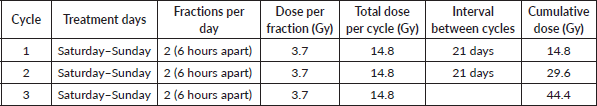 Eligible patients received external beam radiotherapy (EBRT) using QS regimen (3.7 Gy per fraction twice a day, 6 hours apart on Saturday and Sunday only, every 21 days, to a total dose of 44.4 Gy). Response to treatment was assessed at baseline, at 2, 3 and 6 months after treatment completion (Table 1). Table 1 shows the treatment schedule of QS radiotherapy regimen.